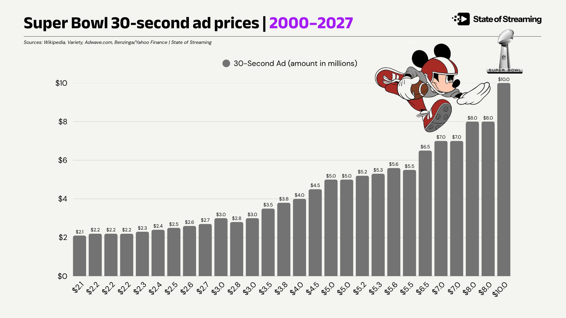 NBC started at $7 million. Advertisers rushed in. Competition pushed prices up. A handful of spots cleared $10 million — because demand got there on its own.
