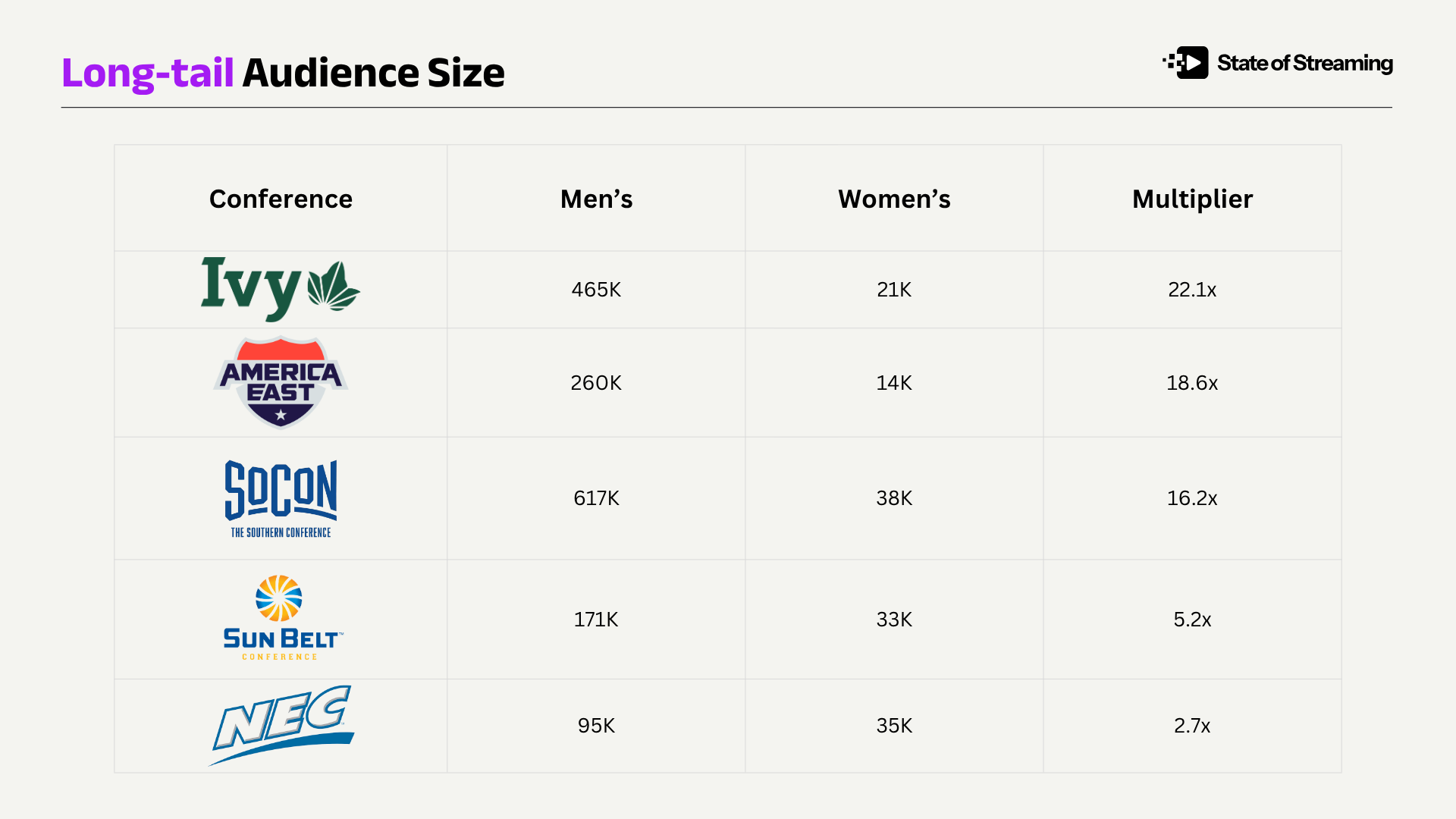 The "multiplier" is just the ratio of how many times larger the men's audience is compared to the women's audience for the same conference. "At the top" means the power conferences — the SEC, Big Ten, ACC, and Big 12.